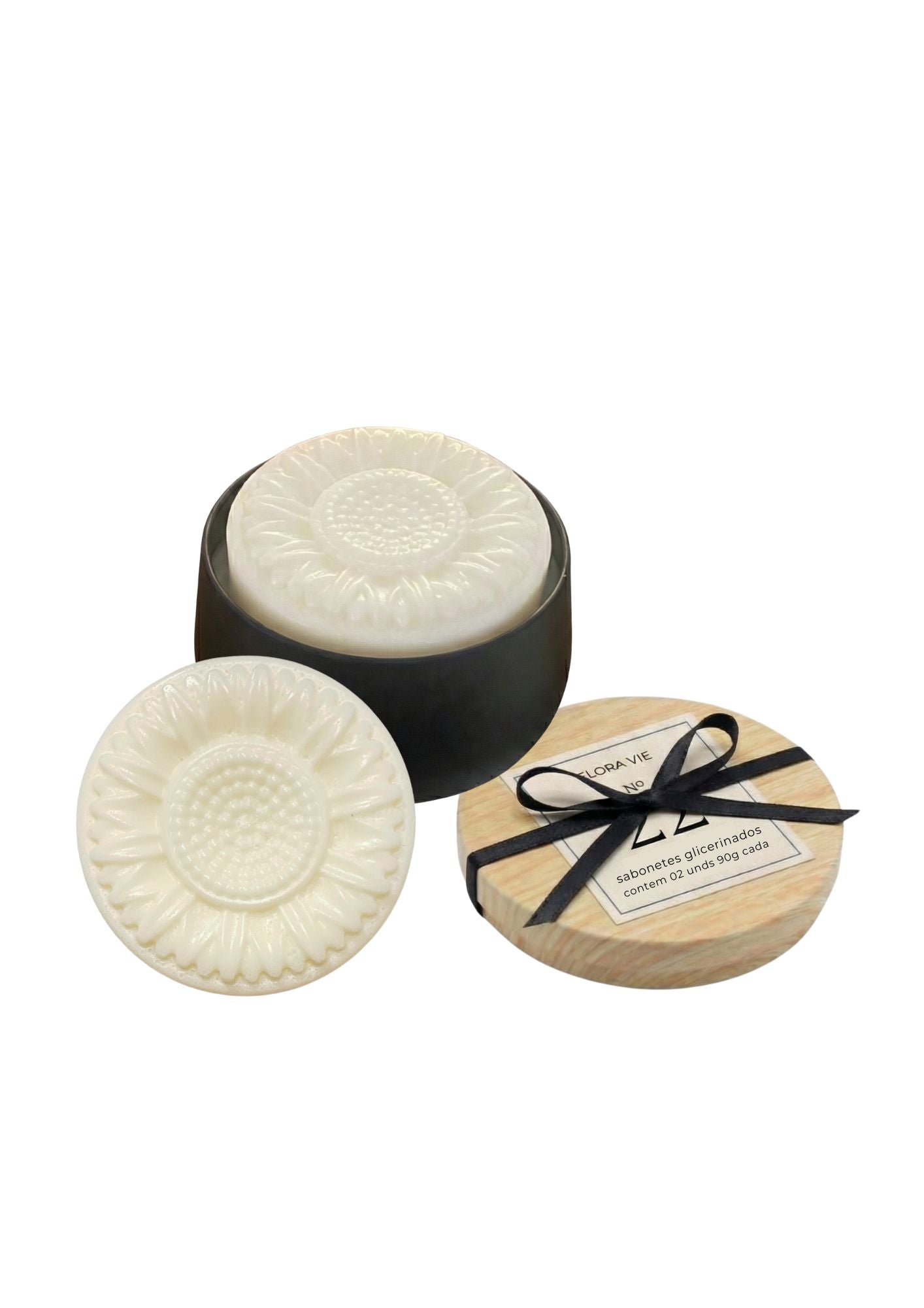O Kit Nº 22 reúne dois sabonetes perfumados de 90g cada. Vem em uma lata preta metalizada com acabamento fosco acetinado, acompanhada de tampa de madeira decorada — um design sofisticado que transforma o produto em peça de decoração.